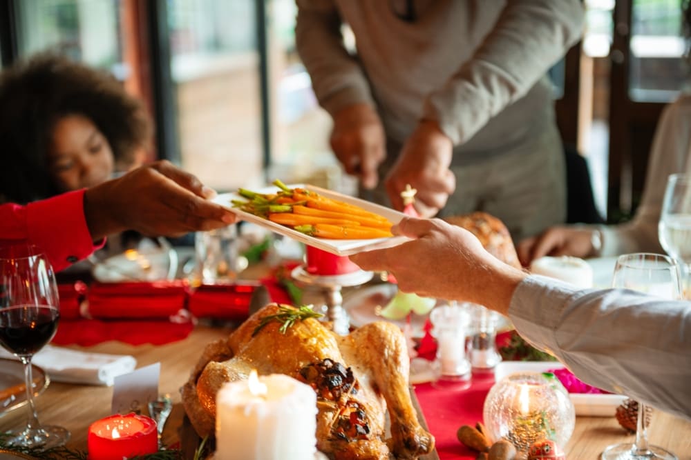 Festive,Dinner,With,Group,Sharing,Food.,Thanksgiving,Meal,With,Turkey